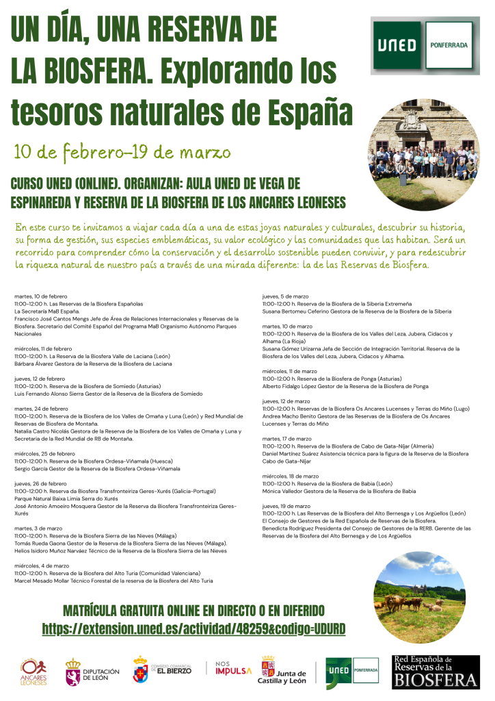 La Reserva de la Biosfera de los Ancares Leoneses y la sede que UNED Ponferrada mantiene en Vega de Espinareda, organizan un curso para dar a conocer la riqueza natural y cultural de las Reservas de la Biosfera españolas, destacando su papel en la conservación de la biodiversidad y el desarrollo sostenible.