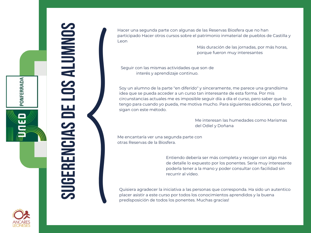 Ha sido además una experiencia completa, por su formato online presencial y en diferido, recibiendo múltiples preguntas para los ponentes, a los que debemos agradecer su disposición y generosidad en la realización de este curso de forma desinteresada. De este modo han favorecido que la matrícula fuese totalmente gratuita para los alumnos, que han podido recibir la información sobre la gestión de las Reservas de la Biosfera de primera mano, por parte de sus gerentes, directores, etc. gracias a la coordinación de la Reserva de la Biosfera de los Ancares Leoneses.