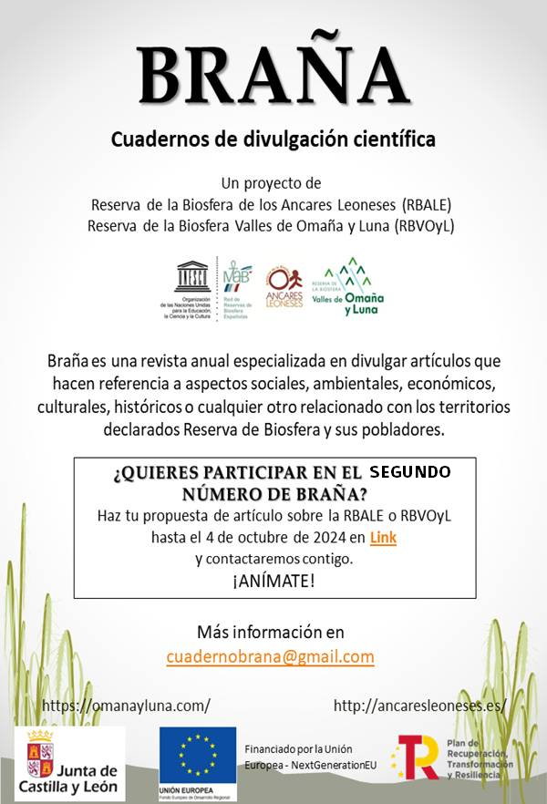 ¿Quieres participar con un artículo en la revista Braña? 📣 Actualmente, está abierto el período de envío de propuestas de artículos para BRAÑA, los cuadernos de divulgación científica de la Reserva de la Biosfera de los Valles de Omaña y Luna y la Reserva de la Biosfera de los Ancares Leoneses: Los autores interesados en